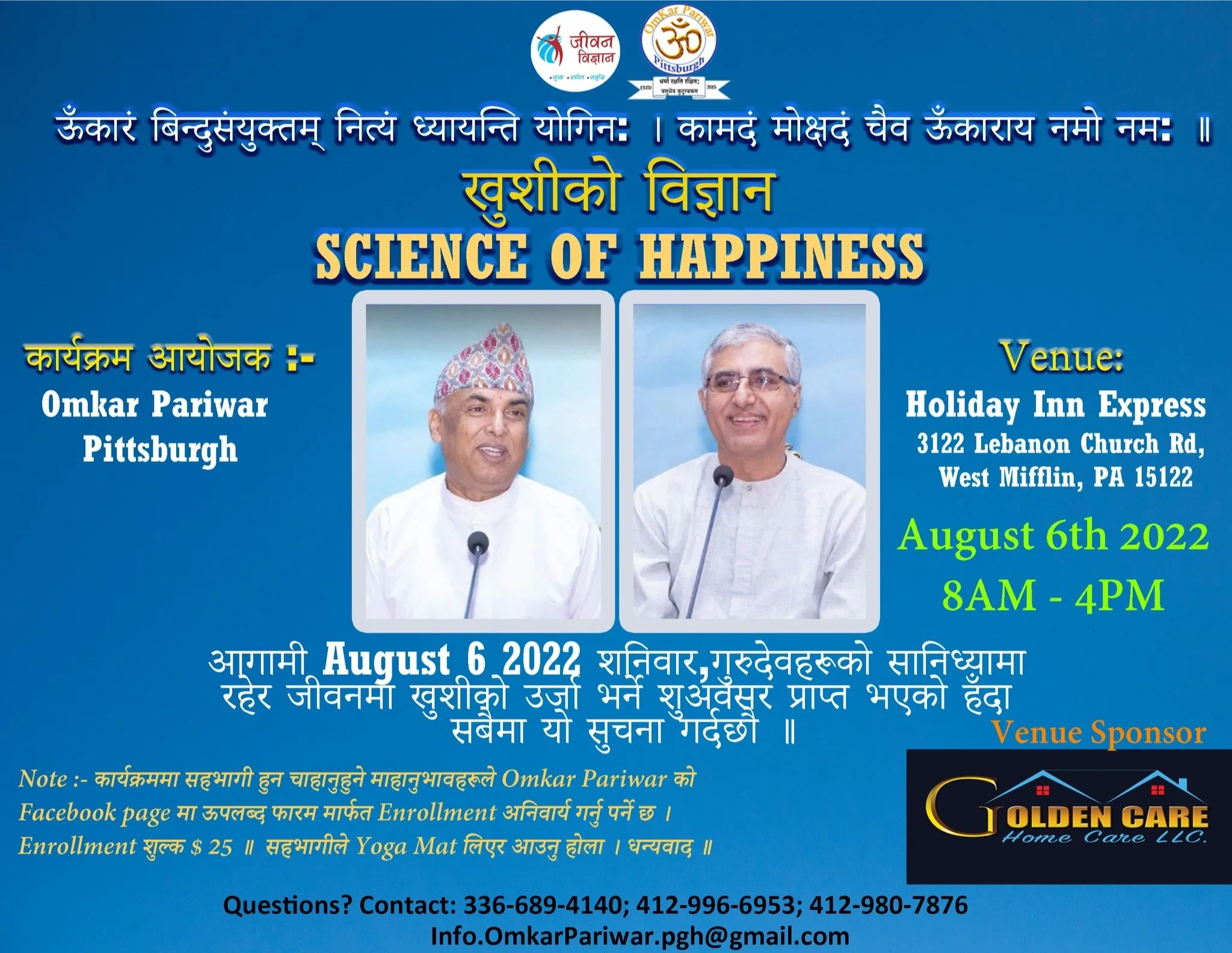 ॐकार परिवारको निमन्त्रणा स्वीकार गर्दै जीवन विज्ञान प्रतिश्ठानका श्रद्धेय गुरुवरहरु रमेश नेपाल र एल पि भनु शर्मा हामीलाई आशिर्बाद दिन यहि २०२२ अगस्ट ६ तारिक शनिवारको दिन हाम्रो पिट्श्बर्ग शहर आउदै हुनुहुन्छ। साथै, खुशि के हो? कहाँ हुन्छ? कहिले हुन्छ? कसरी हुन्छ? किन हुन्छ? भन्ने प्रश्नहरुको उत्तर संगै हाम्रो समाजमा खुशीको उर्जा भर्नेछन। उहाँहरुको दर्शन गर्ने मौकामा ब्यक्तिगत फाईदा लिन हामी सबैलाई आवहान गर्दछौ। PRE-Registration is going on smoothly on first come first serve basis due to limited seats available. If you haven't registered yet, do not wait till the last minute. Click the link to register https://forms.gle/FEGTwvBzyFS3jA7dA
